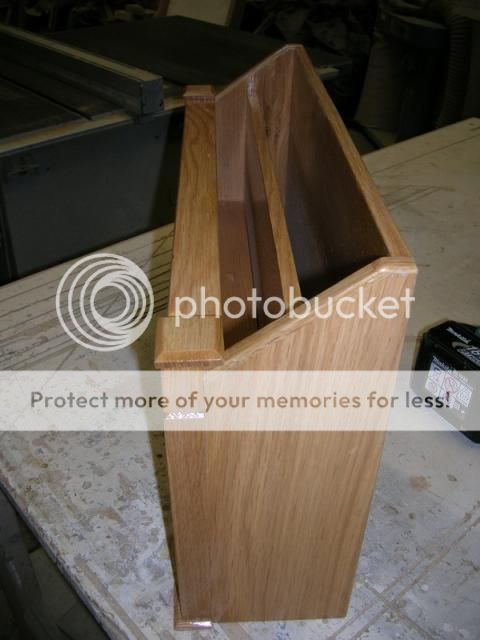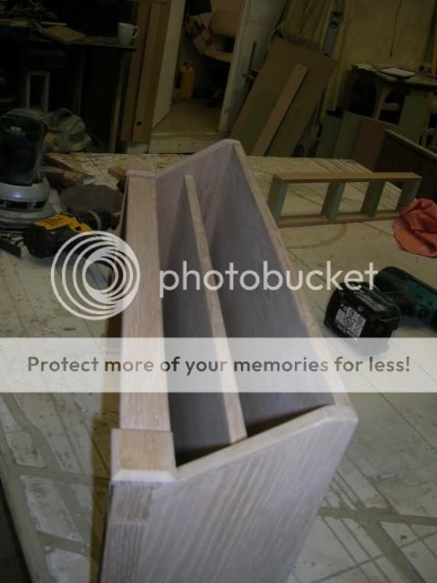 Well not quite a magazine rack as it will hold patterns for sewing and embroidery. If you remember last year I built a set of cabinets for a hobby room in AWO and the customer has had me back a few times for more work. I am in the process of building another pelmet for them and was also asked to make them a rack to fit plastic patterns into when not in use. Details were that it had to sit alongside the units I had built and try to match it into the units. it required two slots of stepped depth and had to be in AWO to match the units. This is what I came up with over the last couple of days ready for a finish.